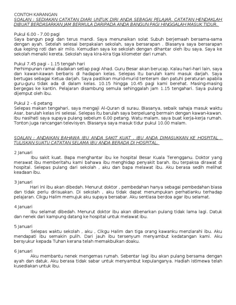 Karangan SPM perlu dikuasai oleh semua murid yang mengambil SPM kerana ini merupakan mata pelajaran yang wajib lulus. Pada masa lapang kita juga boleh membantu ibu membuat kerja-kerja rumah seperti mencuci pakaian memasak menyapu sampah dan sebagainya. Catatan hendaklah dibuat berdasarkan jam bermula daripada anda bangun pagi hinggalah masuk tidur.