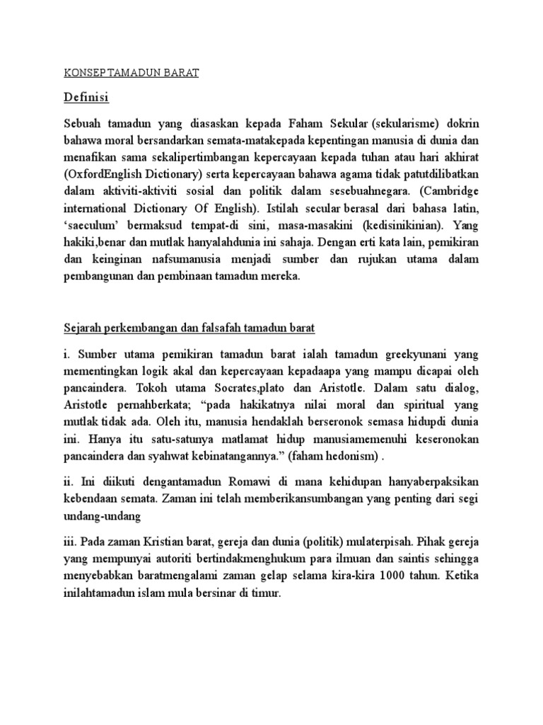 Tamadun ialah peraturan masyarakat yang dapat membantu meningkatkan pengeluaran kebudayaan dan ia merangkumi empat elemen iaitu sumber ekonomi sistem politik tradisi moral dan kesenian. Konsep Tamadun Barat Definisi Tamadun Barat. Tiada sifat mulia diantara hubungan sesama manusia hanya nilai kebendaan.
