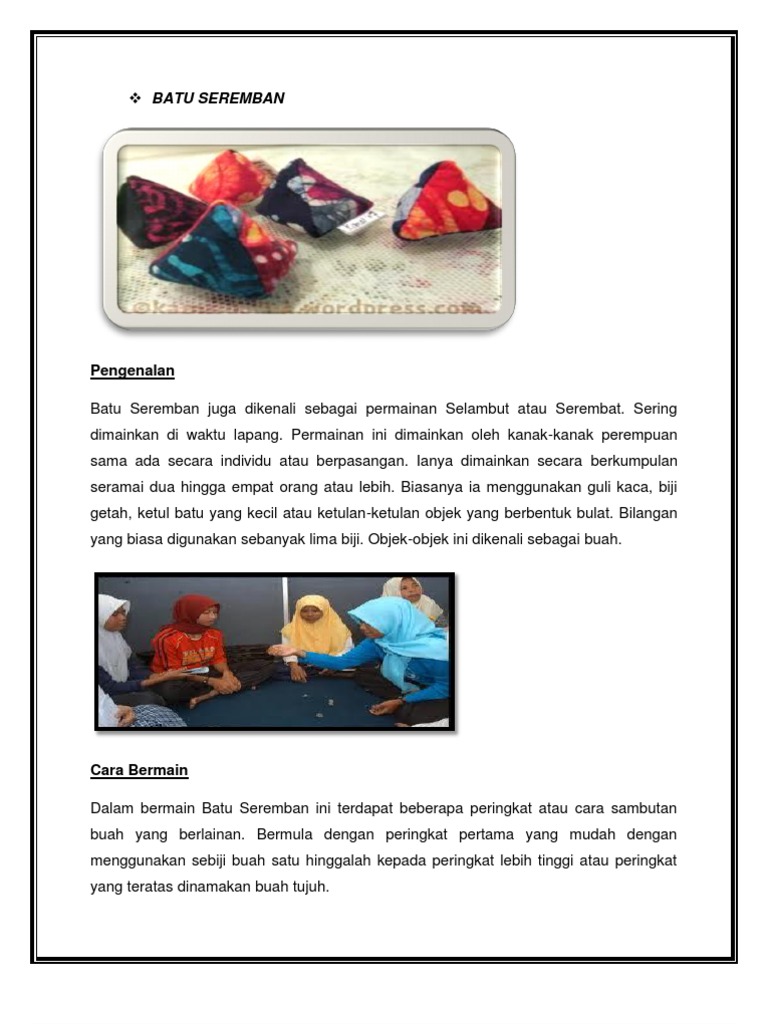 Pada zaman dahulu permainan ini sangat popular dimainkan oleh kanak-kanak perempuan sama ada secara individu atau berpasangan. Asal Usul Batu Seremban Batu Serembat juga dikenali sebagai Batu Selambut atau Serembat. Batu yang dapat ditangkap 1 mata.